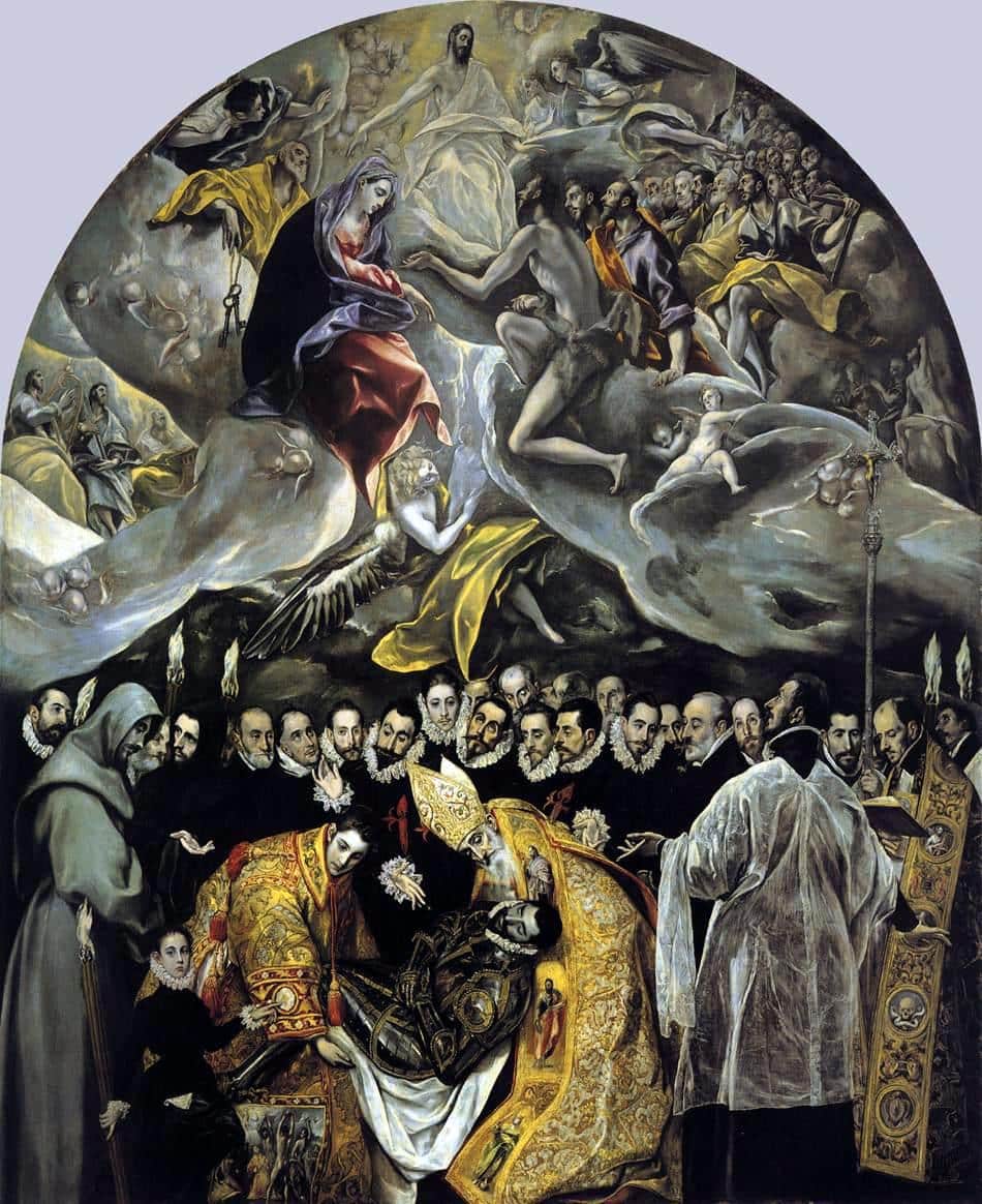 The painting illustrates a popular local legend. In 1323, Don Gonzalo Ruíz, native of Toledo, and Señor of the town of Orgaz, died. He was a religious man who, among other charitable acts, left moneys for the enlargement and decoration of the church of Santo Tomé (El Greco’s town church). At his burial, Saint Stephen and Saint Augustine appeared at his funeral and lowered his body themselves. The burial takes place in 1323, but El Greco represents it as a modern event, portraying among those in attendance many of the local aristocracy and clergy; Titan himself could hardly exceed the dazzling display of colour and texture in the armor and vestments. Above, the count’s soul is carried to heaven by angels. The way the upper half of the painting is filled is very different from the way the bottom half is filled. Every form (clouds, draperies, limbs) takes part in the flame like movement toward the distant figure of Christ. The various aspects of Mannerism combine into a single overjoyed vision in this painting. The Burial also manifests El Greco’s typical elongation of figures and a horror vacui (dread of unfilled spaces), features of his art that became more obvious in later years.