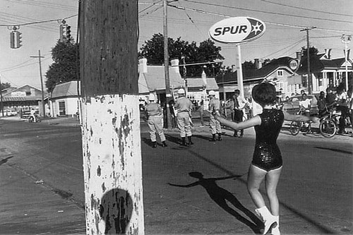 The general course of change in Winogrand’s ideas about photographic form can be seen in two football pictures, the first made in 1953 at a game between the New York Giants and the Cleveland Browns, the second twenty years later in Texas. The first is simple both in graphics and content, and concentrates the game to its most basic confrontation-ball-carrier and tackler. The style of description is literal and encyclopedic the subject of the picture is not the drama but the excitement. As Winogrand grew older and his ambition grew more demanding, his work grew larger. As his motifs became more complex, and more unpredictable in there the composition, the chances of success in a given frame became smaller. In 1963, his first substantial museum showing, forty-five of his photos were included in the exhibition Five Unrelated Photographers, at The Museum of Modern Art. In that same year he first applied for a Guggenhiem Fellowship, which he was granted the following spring. The fellowship allowed him a year, more or less, in which to travel and photograph, free of commercial pressures for the first time in his career. Pictures from the