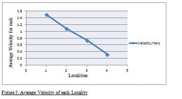 In the graph below the average velocity for each locality is displayed which decreases steadily from the mouth of the river upstream. The first area which was studied, Locality1, has the highest average velocity of 1.51ms-1. Locality 2 was studied secondly, and the velocity of the channel was calculated which was 1.09ms-1. The velocity for Locality 3 was also calculated which resulted to be 0.74ms-1. In the last locality located near Hillside, the velocity for the section of the river channel was calculated to be 0.33ms-1.