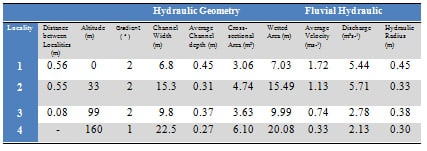 Using the cross-sectional area, which was obtained from the cross-profiles plotted on a graph, and the velocity at each site of study, which was calculated using the length and time of the section of the channel flow, the discharge was calculated at each locality. The hydraulic radius was also calculated using the cross-sectional area and the wetted perimeter, both of which were calculated by using the length, width, and depth of the channel, respectively.