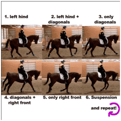 The canter and gallop are very similar. The canter ranges from about 16-27 km/h. The canter is a three-beat gait which, if listened to, sounds like three beats, then a short pause, then another three beats. See picture, right, for gait sequence.