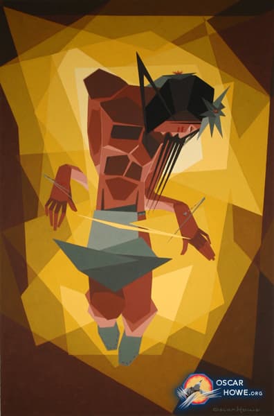 There, Howe began to develop his personal style which included cubism mixed with Sioux influences. In 1957, at age 43, Oscar Howe was appointed Assistant Professor of Fine Arts at the State University of South Dakota. During the same year, he also held his first one-man retrospective in Santa Fe, New Mexico.