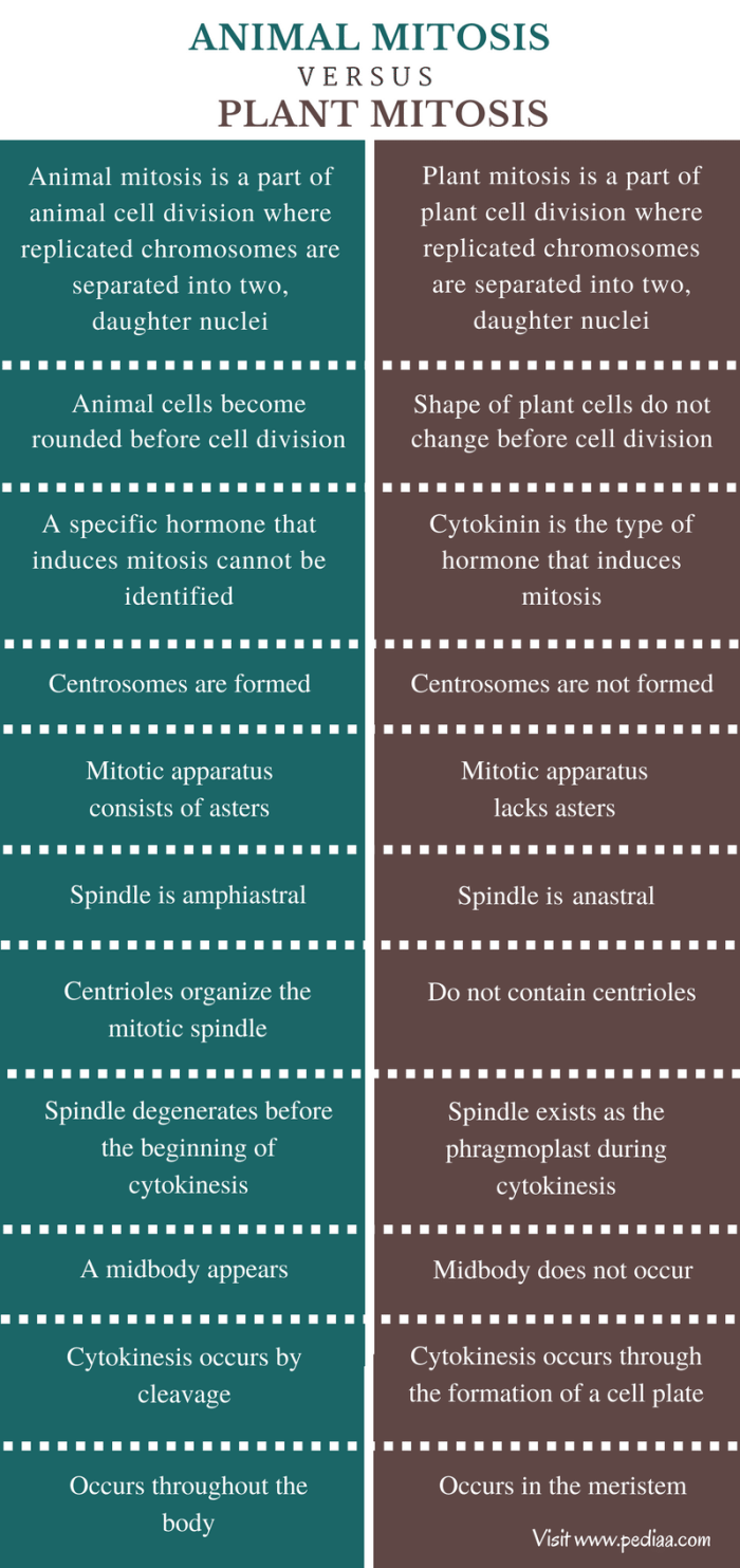 Animal Mitosis Plant Mitosis Have centrioles, centrosomes, and asters No centrioles, centrosomes or aster: No Migration of centrioles. Cell becomes rounded before cell division No change in shape before cell division Cell division induced by multiple hormone to start cell division; no known specific cell division hormone. Cell division induced by specific hormone called…