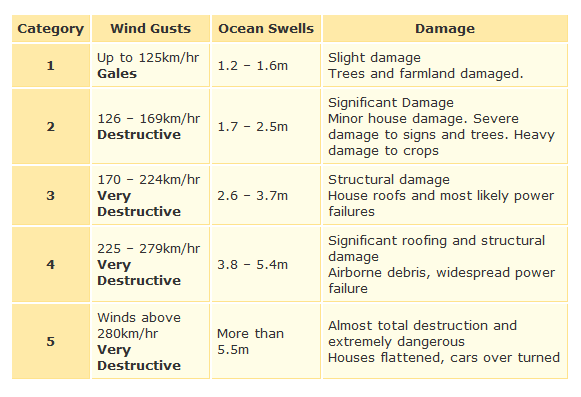 These winds have a life-span of at least six hours. The winds are capable of extending over hundreds of kilometres from the centre of the cyclone. A tropical cyclone will be classified as severe if the sustained winds exceed 118km/h and the gusts are over 165km/h.